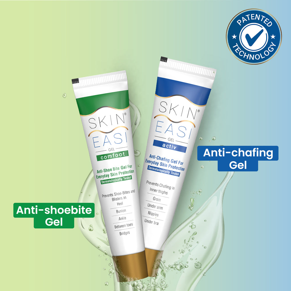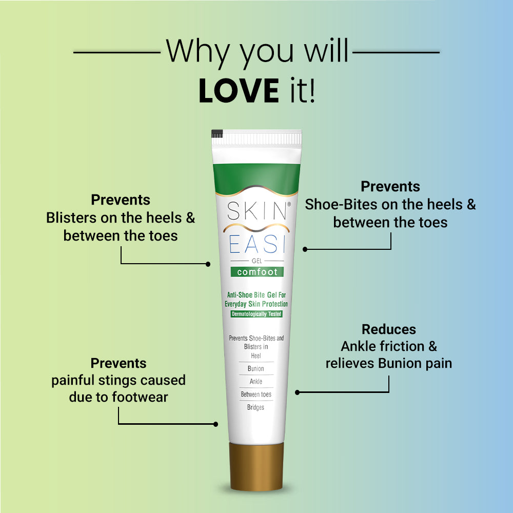 Skineasi comfoot forms a thin film of silicone within 30 seconds of its application on shoe-bite prone areas. This film, like second skin, acts as a barrier between skin and shoe or any other foot wear thus preventing shoe-bites. The thin film formed by Skineasi comfoot is invisible, long-lasting, non-allergenic, water-repellent and most importantly breathable unlike other make shift solutions. The thin film formed by Skineasi comfoot not only gives silky feel to skin but also works well in presence of water or moisture.