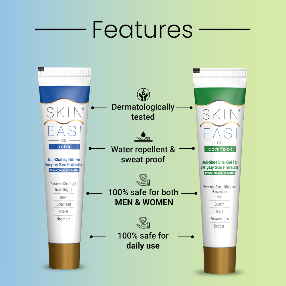 Skineasi activ forms a thin film of silicone within 30 seconds of its application on chafe prone areas. This film, like second skin, acts as a barrier between skin or skin folds or between skin and clothing thus preventing chafing. The thin film formed by Skineasi activ is invisible, long-lasting, non-allergenic, water-repellent and most importantly breathable unlike other make shift solutions. The thin film formed by Skineasi activ not only gives silky feel to skin but also works well in presence of water, sweat or moisture.