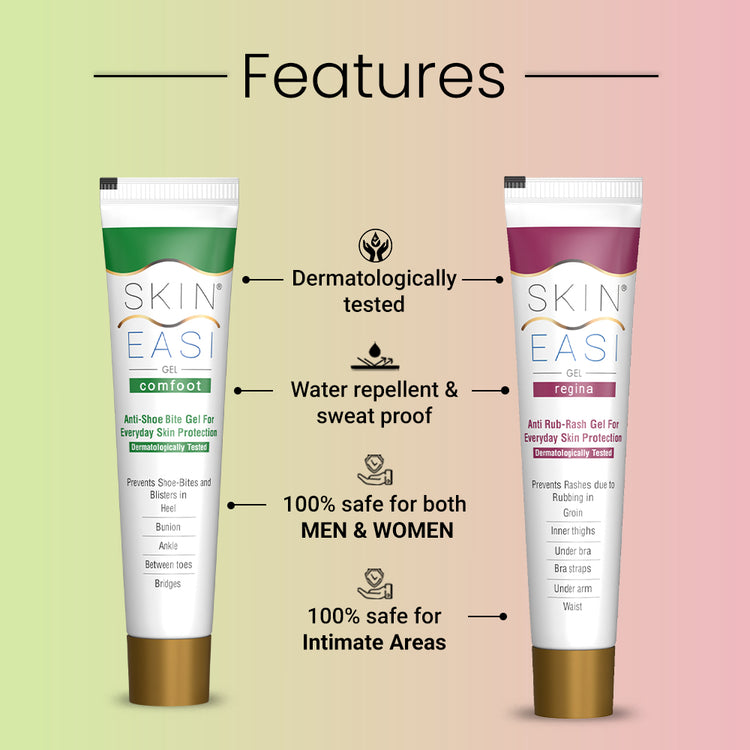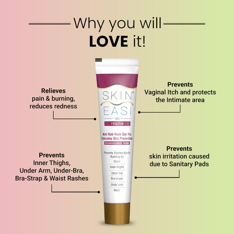 SkinEasi regina is a silicone-based anti-rash gel designed to protect and soothe your skin from everyday friction. It prevents inner thigh rash, pad rash, vaginal itching, and discomfort from bra underwire and straps, ensuring you stay comfortable all day.