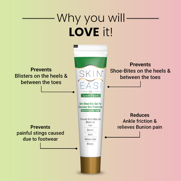 SkinEasi comfoot is a silicone-based anti-shoebite gel that acts like a protective sock for your feet and prevents shoe-bites, blisters, and friction pain. Perfect for daily use, it keeps your feet comfortable and blister-free in any footwear.