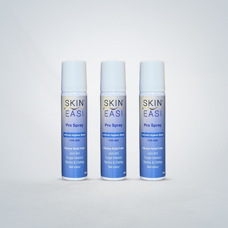 Jock itch is a fungal infection that causes itching, redness, and irritation in the groin area. SkinEasi® Pro Spray helps by reducing fungal growth, soothing irritation, and creating a dry protective barrier that prevents the infection from worsening or recurring.